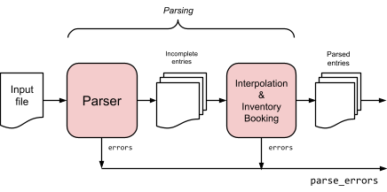 At the root of the main package is a beancount.loader module that coordinates everything that has to be done to load a file in memory. This is the main entry point for anyone writing a script for Beancount, it always starts with loading a stream of entries. This calls the parser, runs some processing code, imports the plugins and runs them in order to produce the final stream of directives which is used to produce reports.